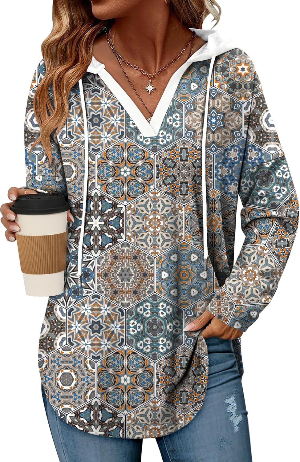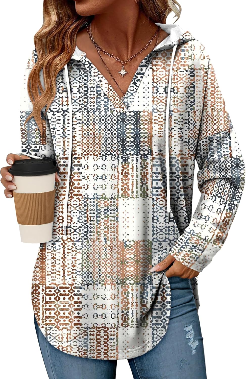 - 【Features】:Casual Hoodies for Women that features Vneck,Long-sleeved,Pullover,Hooded Shirt with Adjustable Drawstring. Curved Hem and Loose Style Makes You Look More Generous and Could Hide Your Belly Perfectly