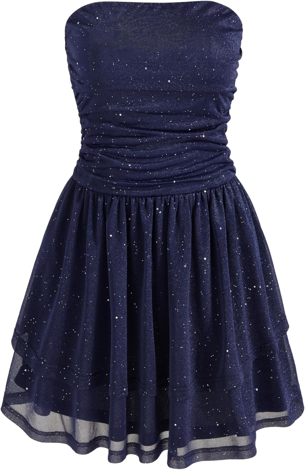 CIDER Women's Summer Cocktail Dress - Tube Ruched Ruffle Mini Dress