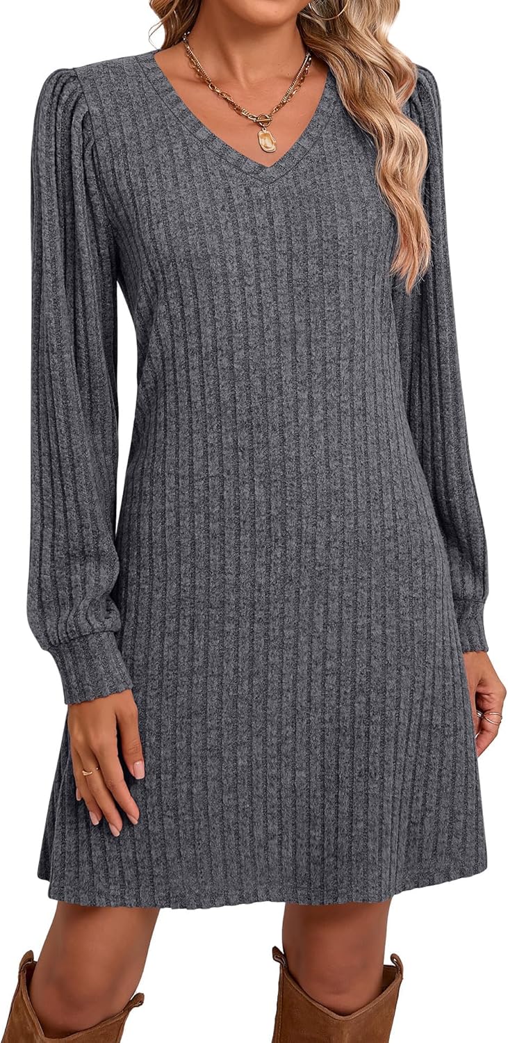 - Distinctive Features: this woman sweater dress showcases features such as an elegant v neck, stylish long sleeves, above knee length, and a solid color design; The gathered shoulders add a feminine touch that enhances the figure flattering silhouette of this comfortable dress