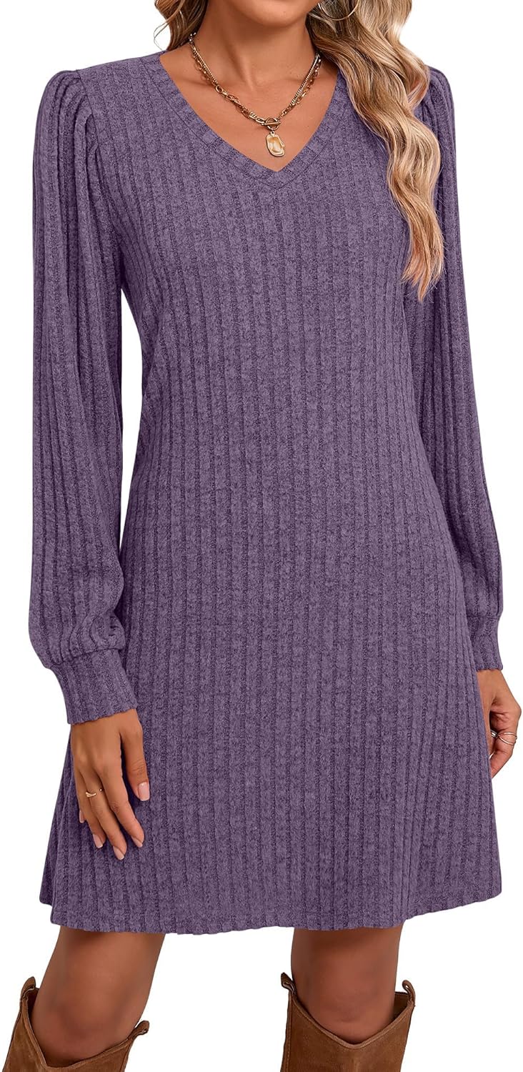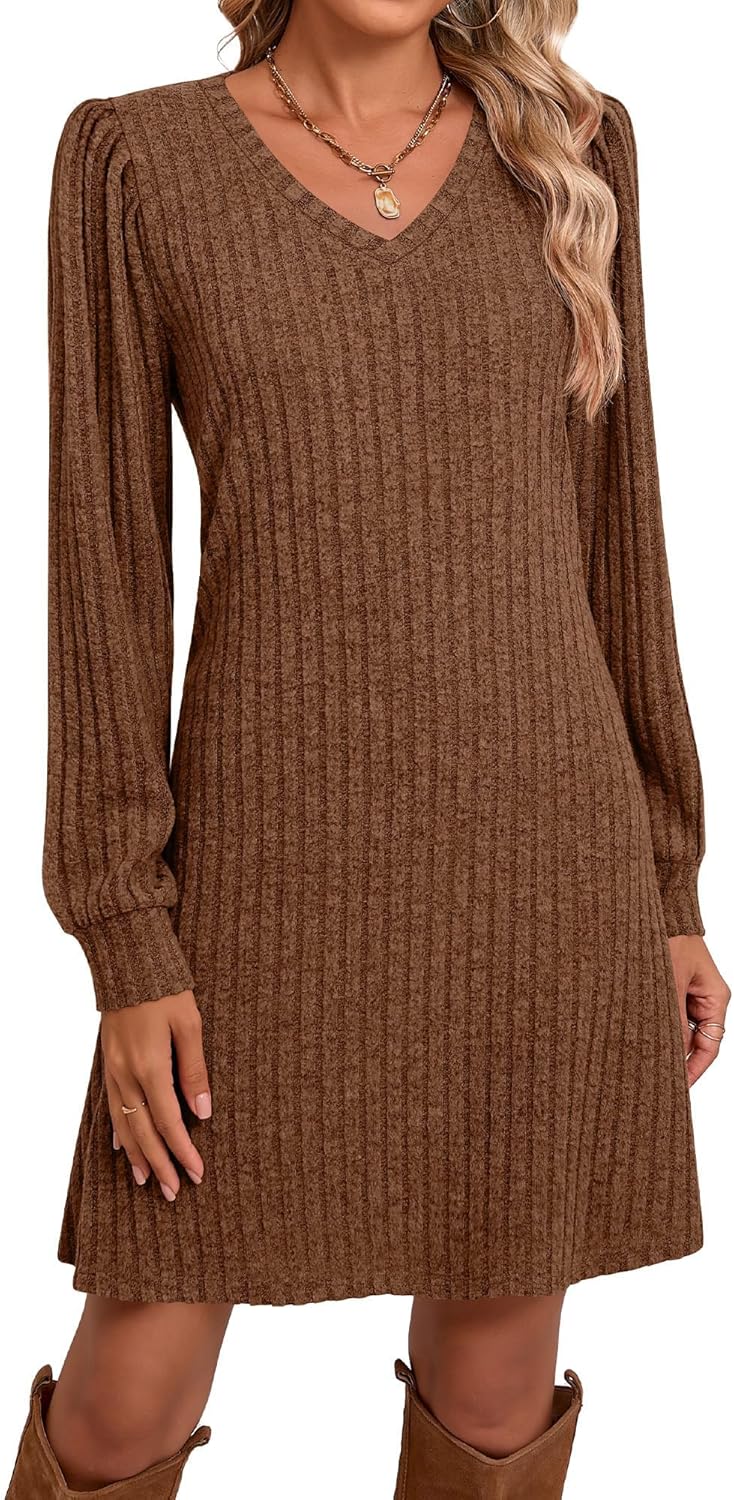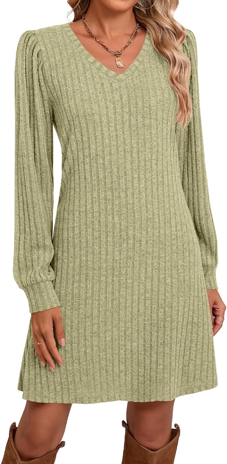 Ficerd Women's Knit Long Sleeve Sweater Dress Casual V Neck Tunic Dresses Fall Trendy Outfits