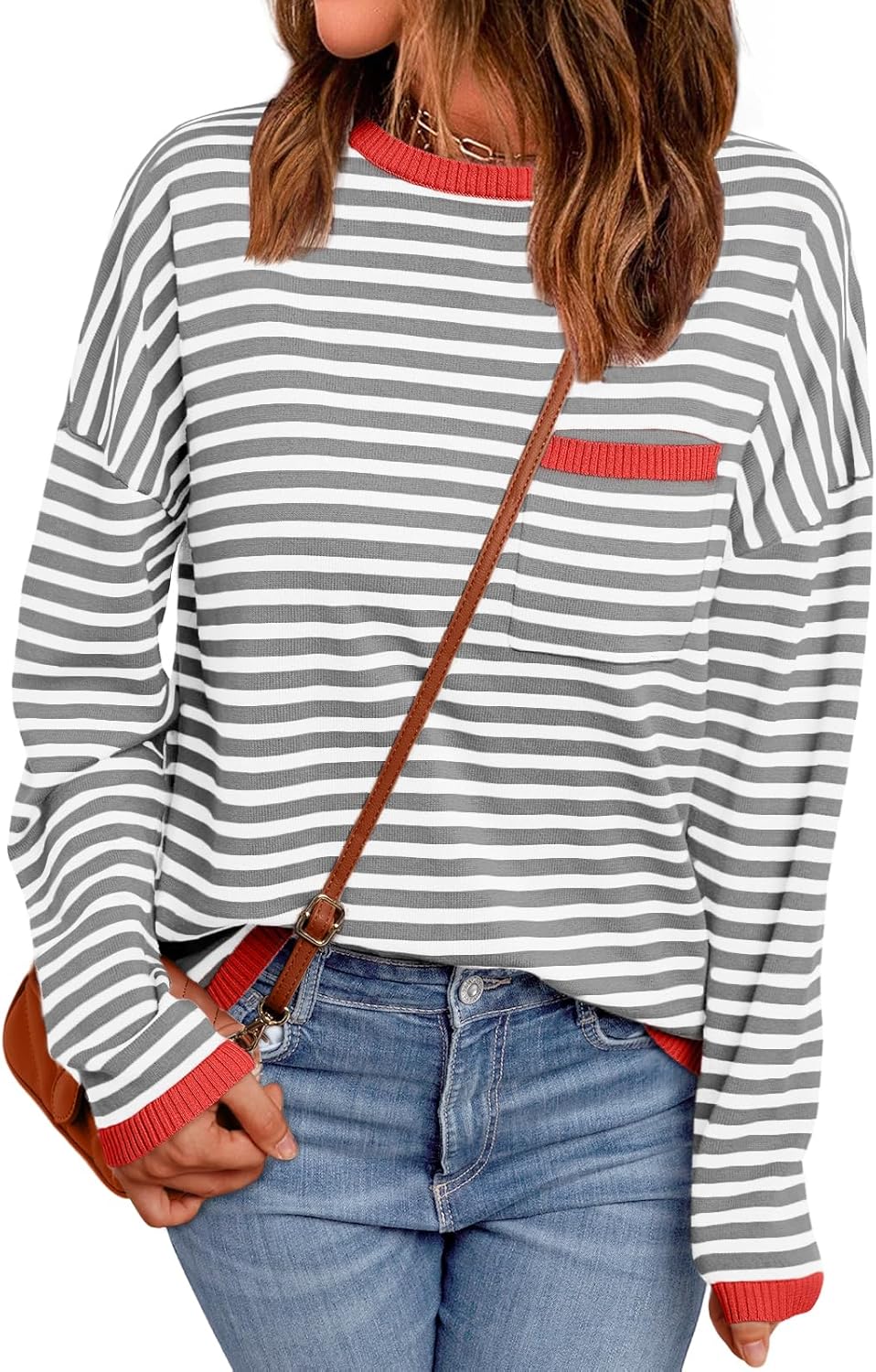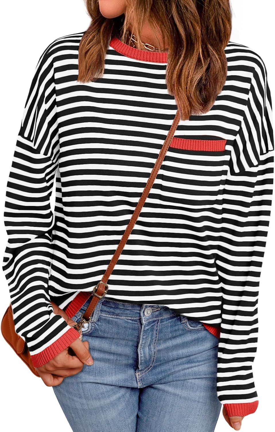 LILLUSORY Womens Striped Soft Knit Pullover Sweater Loose Fit Shirts with Chest Pocket