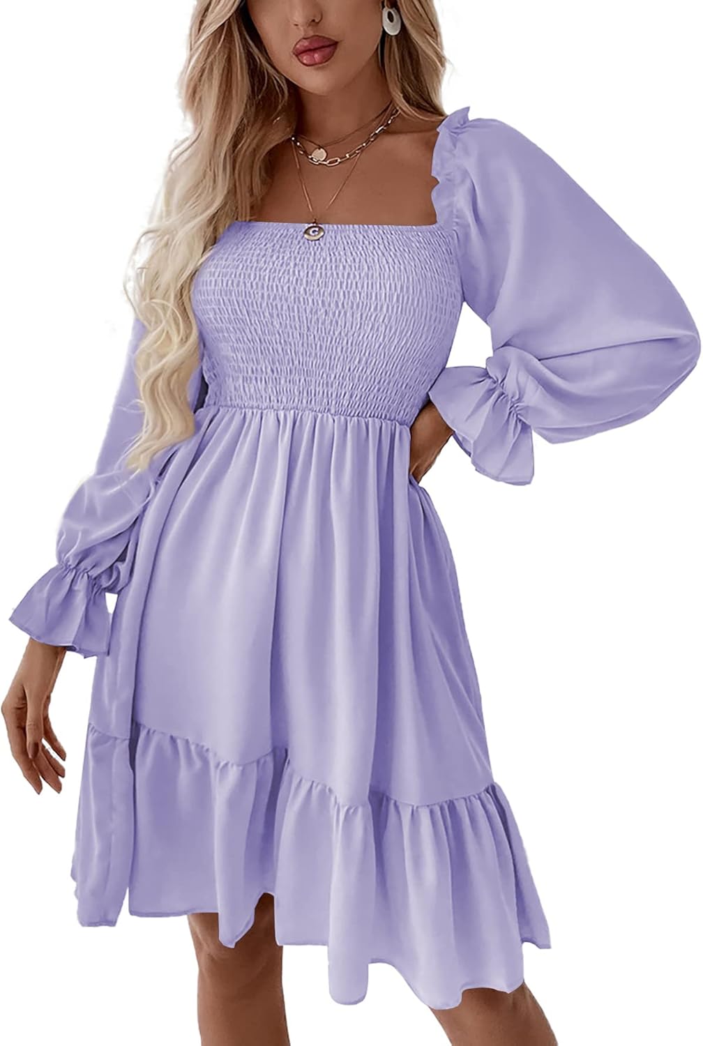- Features: square neck, shirred bust, ruffle swing,lantern long sleeve, elegant design, flowy mini dress.