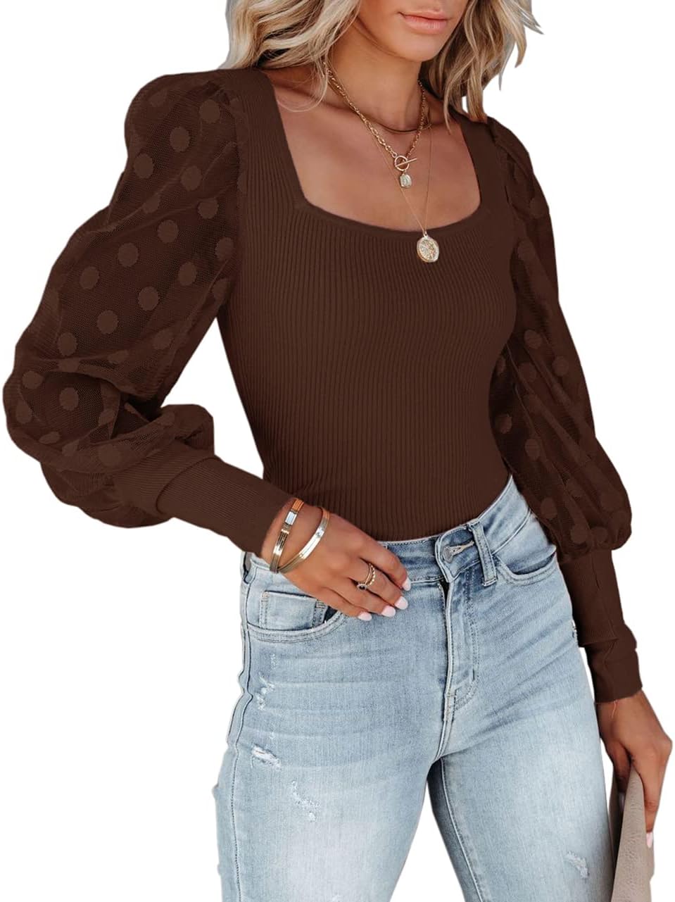 miduo Womens Tops Square Neck Polka Dot Balloon Long Sleeve Top Shirts Slim Knit Ribbed Tops Blouses