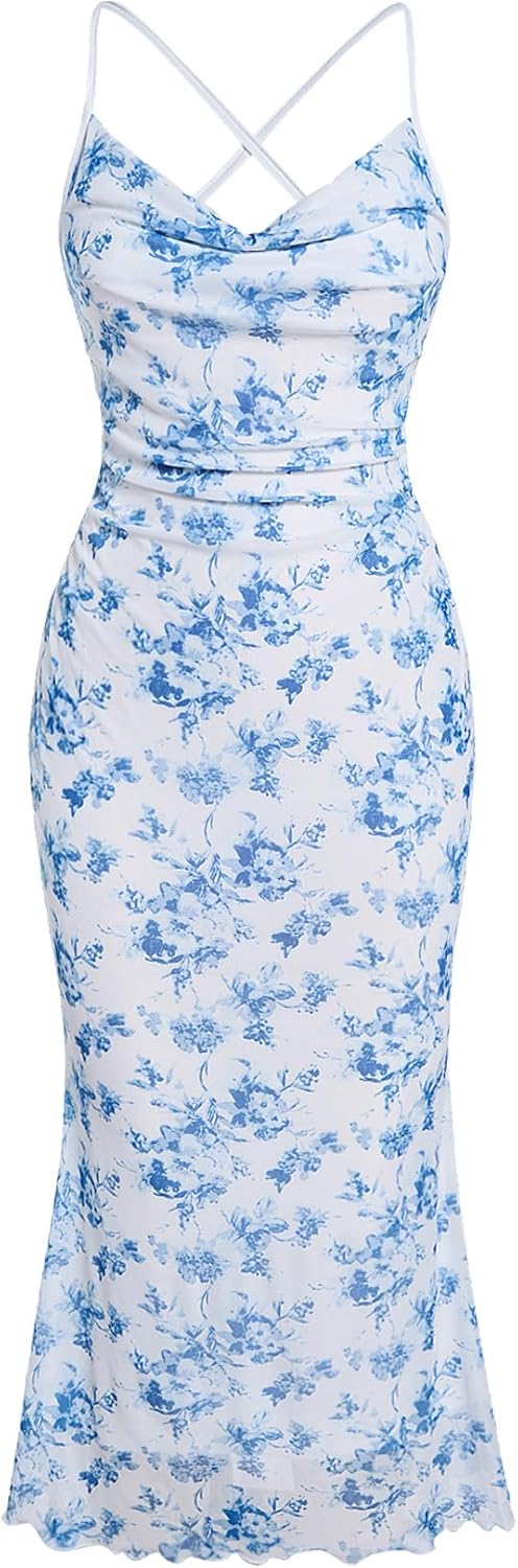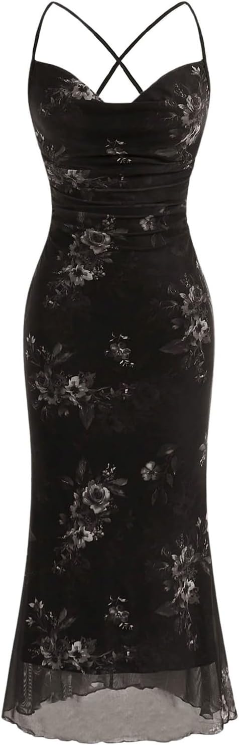 SOLY HUX Women's Floral Mesh Bodycon Cami Dress Cowl Neck Sleeveless Cocktail Party Wedding Guest Long Maxi Dresses