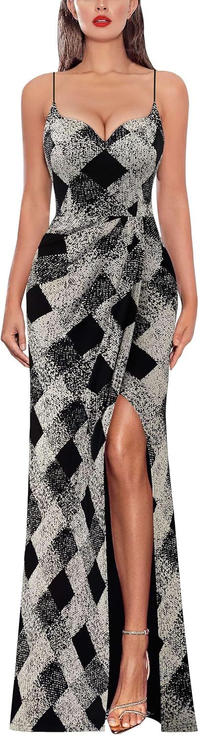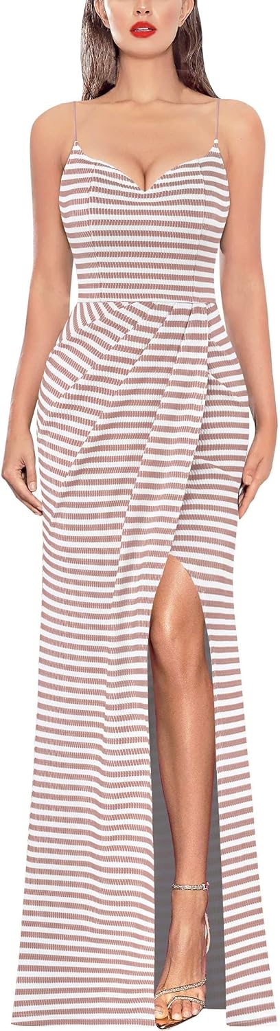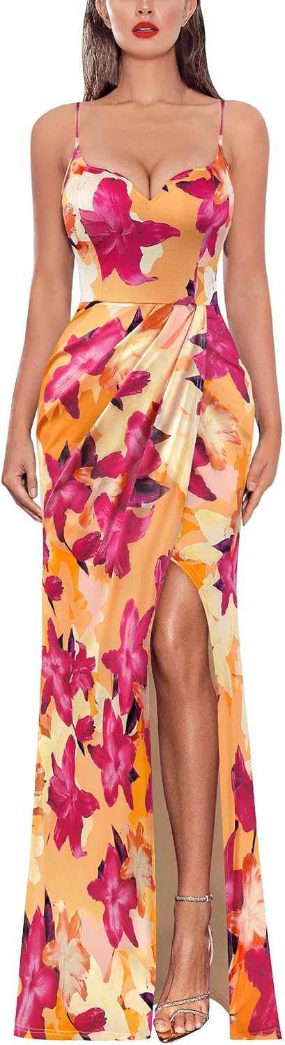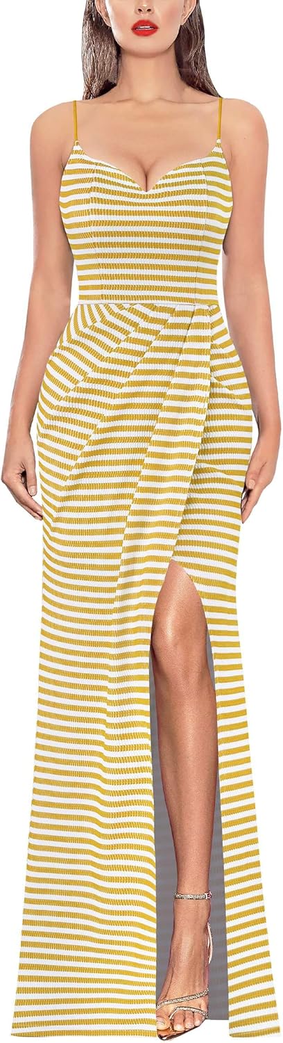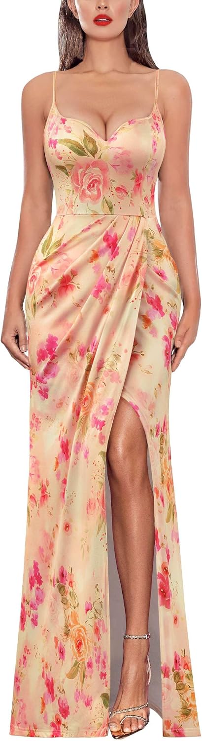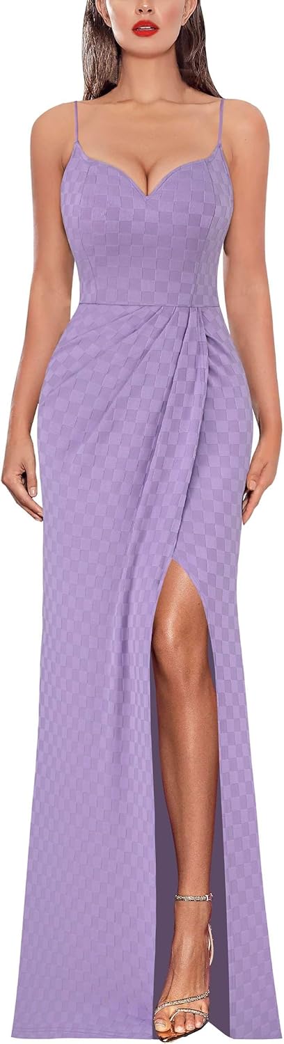 VFSHOW Womens Sexy Formal Ruched Fitted High Slit Bodycon Maxi Dress Spaghetti Strap Sweetheart Cocktail Prom Evening Gown