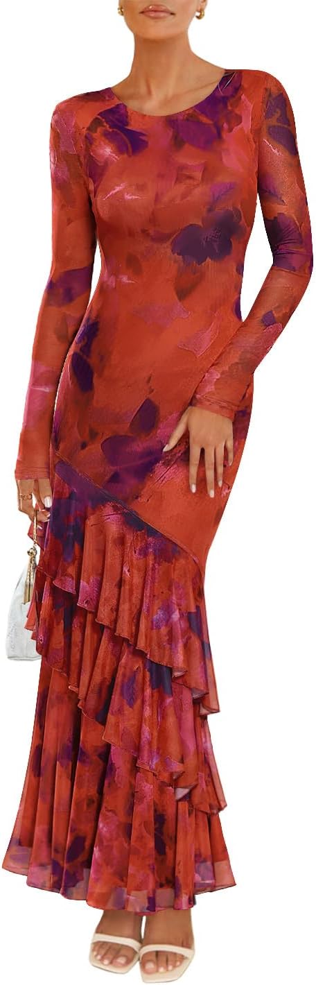 ZESICA Women's Fall Floral Wedding Guest Bodycon Dresses 2025 Long Sleeve Crewneck Mesh Ruffle Mermaid Party Maxi Dress