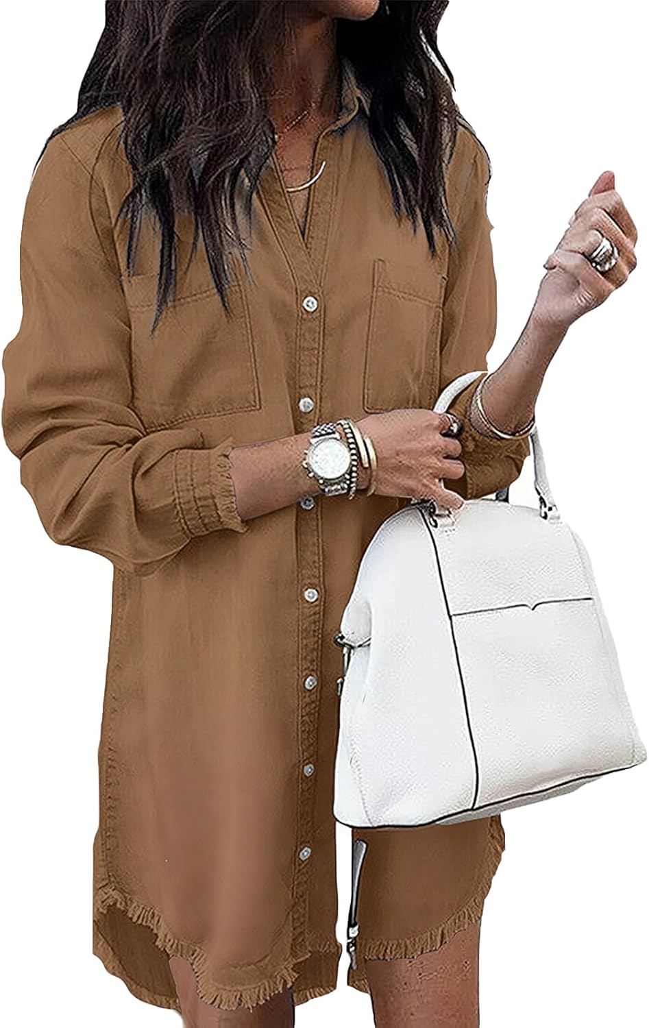 - Features: Denim dress for women features with loose-fit long sleeves,a pointed collar and a button-up front,designed with a curved shirttail frayed hem,can regard it as button down tunic jean dress or long denim shirt,above the knee length cool-weather denim dress,cut with a relaxed fit,finished with two chest pockets